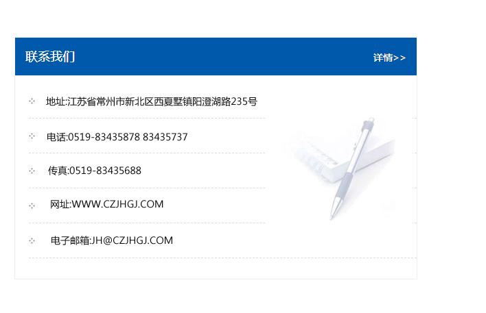 傳真:0519-83435688    郵編:213135    網(wǎng)址:WWW.czjhgj_com.zj86w.com    電子郵箱:JH@czjhgj_com.zj86w.com